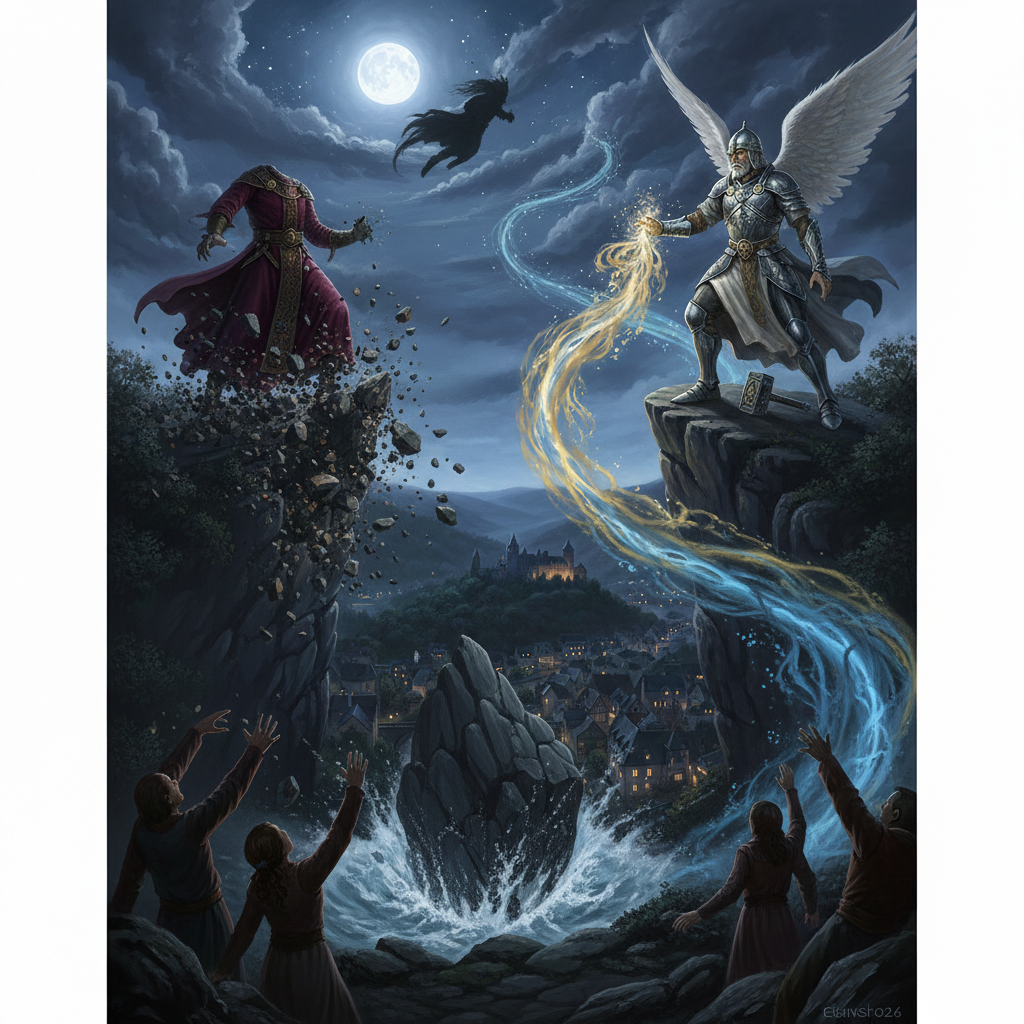Seine Predigt war ein Lied aus Samt und Seide. Er versprach den Talbewohnern eine Welt ohne Mühe, ein Leben ohne Tränen und eine berauschende Vergessenheit. Viele im Tal hielten inne, ließen die Sensen sinken und blickten mit sehnsüchtigen Augen hinauf zum dunklen Felsen, bereit, ihr Selbst für ein Versprechen aus Trug und Schein aufzugeben. Doch im selben Augenblick entzündete sich auf der gegenüberliegenden Seite des Flusses ein Licht, das nicht von dieser Sonne stammte. Auf der Engelskanzel materialisierte sich ein Wesen, dessen Gewand aus dem reinsten Weiß der Wintermorgen gewebt schien.