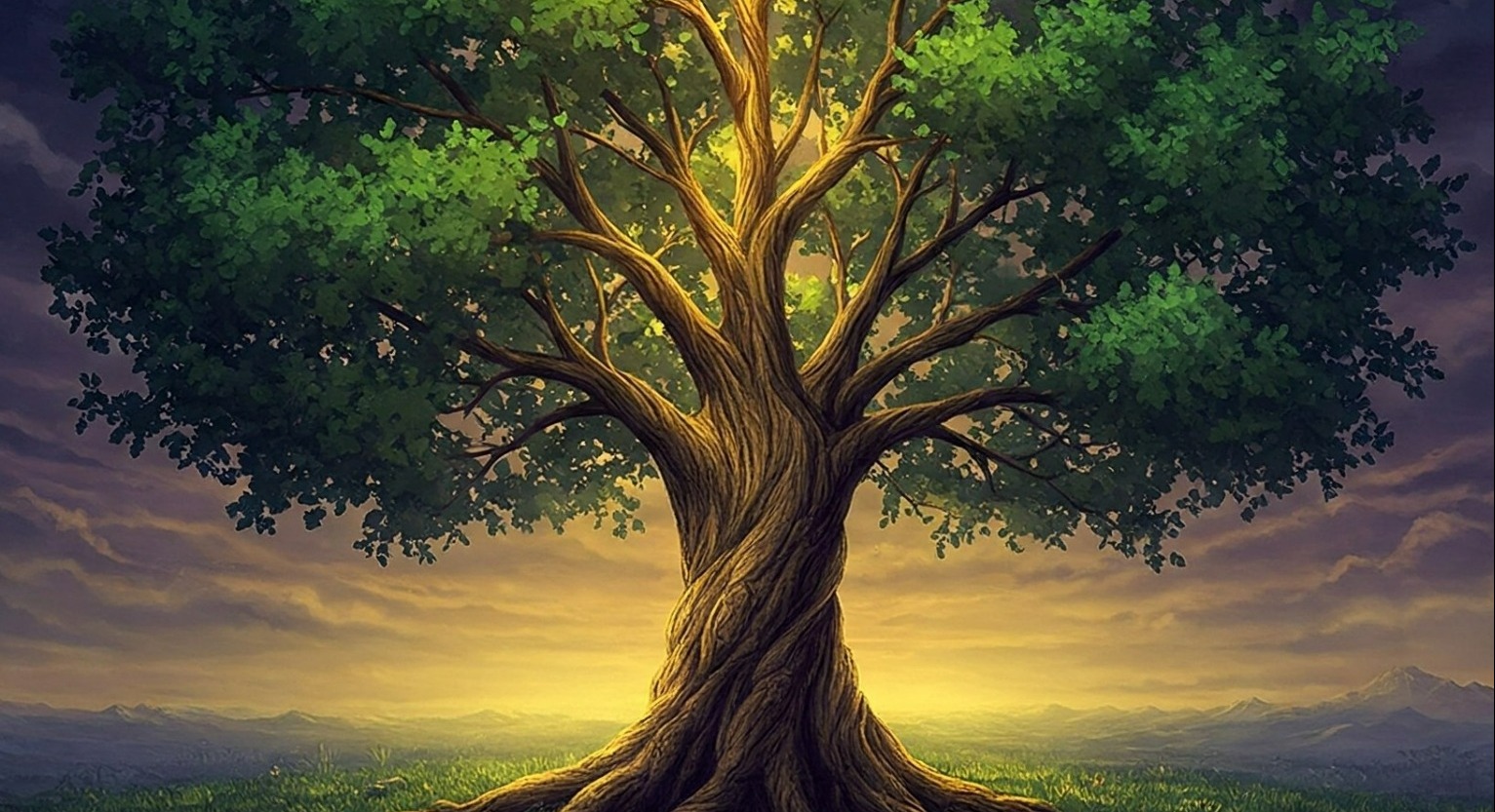 * Der Baum dient als kraftvolles Symbol für die menschliche Existenz, mit Wurzeln, die in unserer Vergangenheit und unseren Erfahrungen verankert sind, und Ästen, die nach der Zukunft und unseren Träumen greifen.