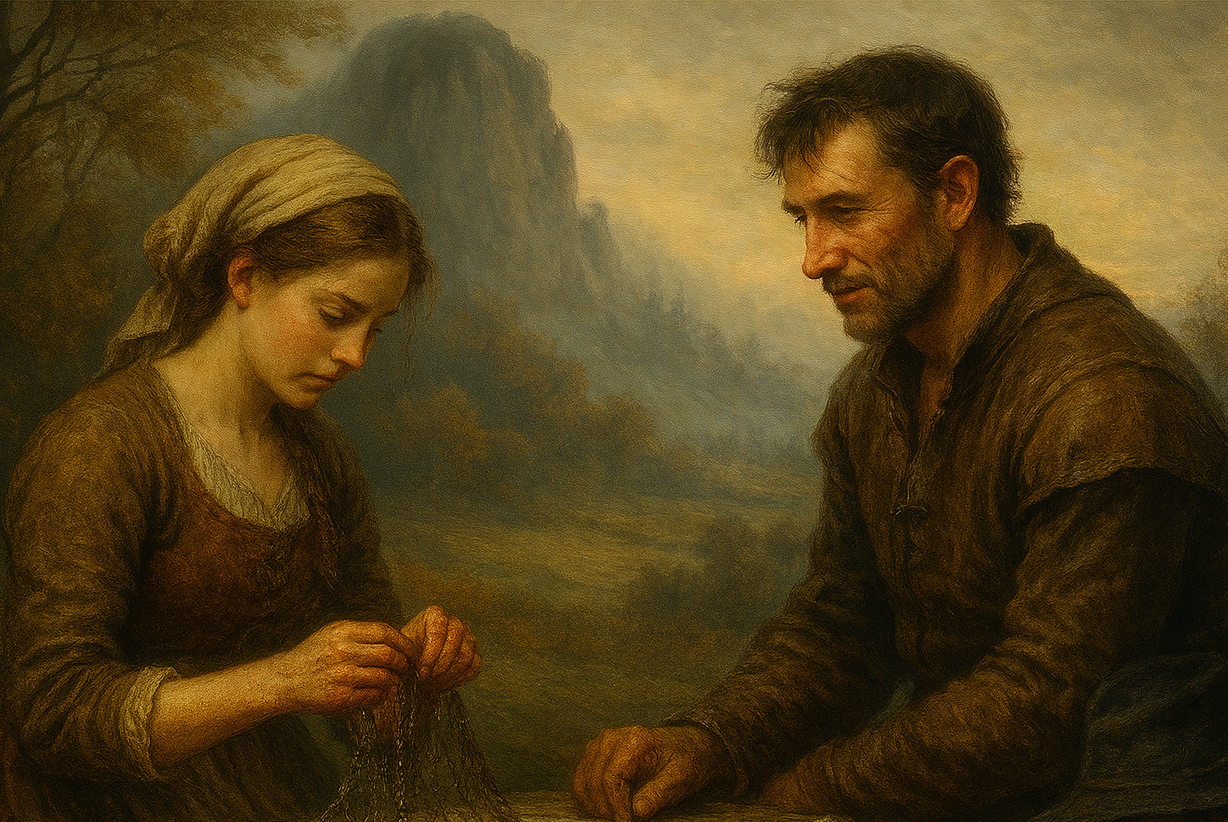 Konrad ließ den Stock los und trat vor. Ein kurzes Ausatmen entwich ihm, wie das Ablegen einer Rüstung. Sein Blick bat um Erlaubnis, heimzukehren. "Ich ward ehrenhaft entlassen", sagte er leise. Die Wunde heilte nicht ganz; doch sie hatte ihn frei gemacht. Er zog das Leinentuch aus dem Beutel; die Fasern waren weich, ein feiner Harzgeruch haftete noch daran. "Ihr brachtet's mir. Es hat mich getragen."