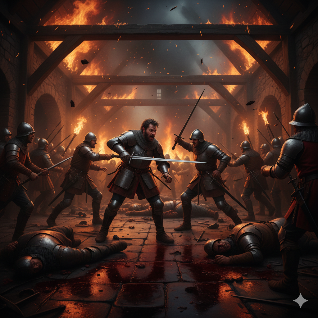 Die Tore wurden von Verrat geöffnet. Die Württemberger stürmten ein, und sofort verwandelten sich die Gänge der Burg in ein Inferno. Feuerfunken sprangen von Fackeln, Holzsplitter regneten herab, Schwerter rissen Fleisch und Rüstung, Schreie hallten von den Wänden wider. Freunde fielen unter den Händen der Feinde, Leichen türmten sich, und der Boden war glitschig vom Blut, das durch die Hallen floss wie ein roter Strom.