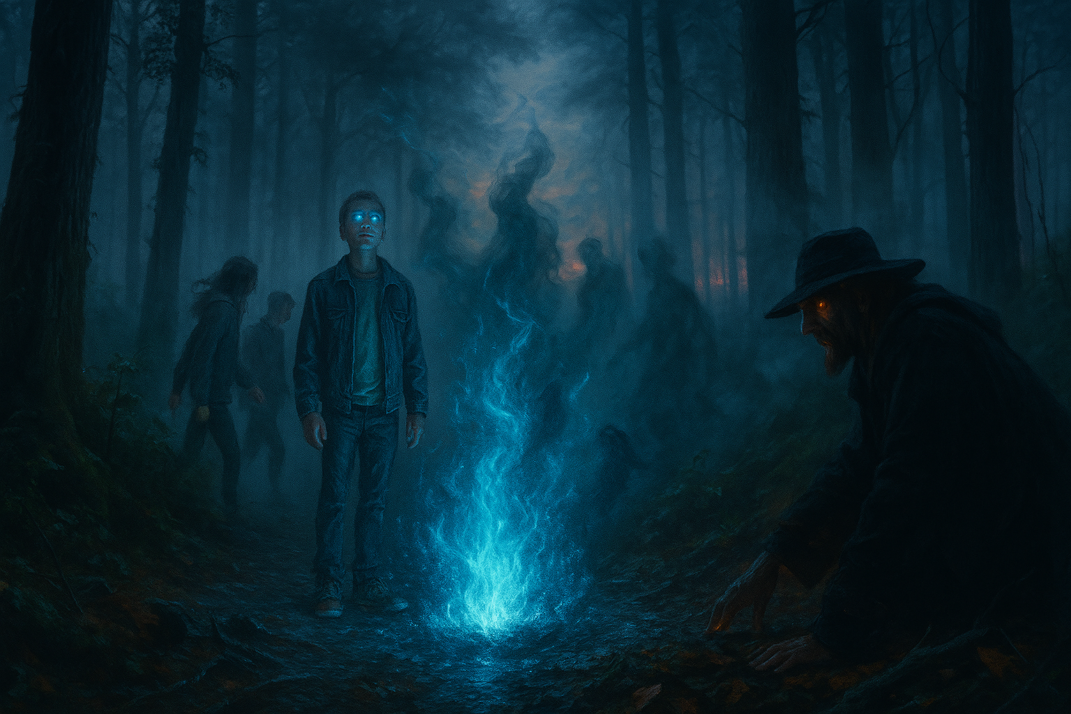 Ein fernes Knistern brach die Stille. Zwischen den Stämmen glomm ein bläuliches Licht, dort, wo die Lichtung lag – kein Feuer, kein Rauch. Es pulsierte, atmete, als lebte der Wald selbst.