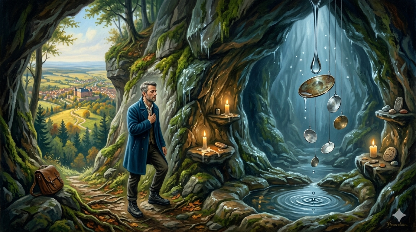 Es war, als hätte jemand den Lärm der Welt gedämpft. Der Regen klang fern, wie eine Erinnerung an Unruhe. In der Höhle blieb nur das rhythmische Fallen des Wassers in eine kleine steinerne Mulde.