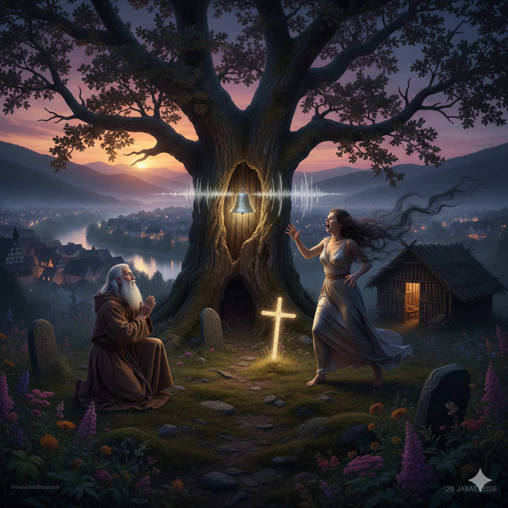 Zitternd vor Ehrfurcht folgte der Klausner dem Ursprung des Klangs. Er führte ihn direkt zum hohlen Stamm der uralten Eiche. Dort, tief im Holz verborgen, fand er ein winziges Glöcklein aus reinem Silber, das von unsichtbarer Hand bewegt wurde und unaufhörlich läutete.
