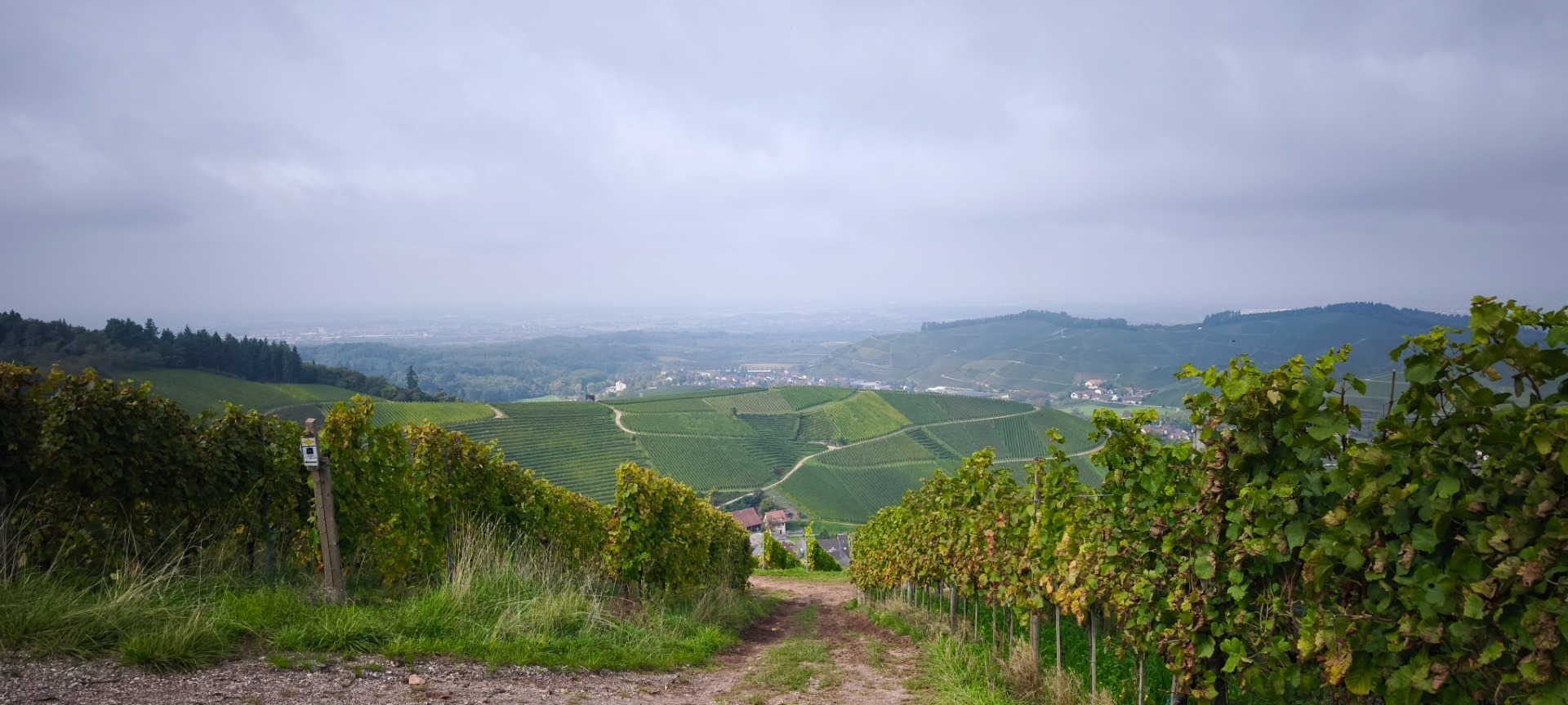 Panoramareicher Premiumweg durch Durbachs Reben und Wälder. Vielfältige Ausblicke auf Rheinebene, Vogesen, Schwarzwald (Hornisgrinde) und Schloss Staufenberg. Einkehr bei Top-Weingütern.