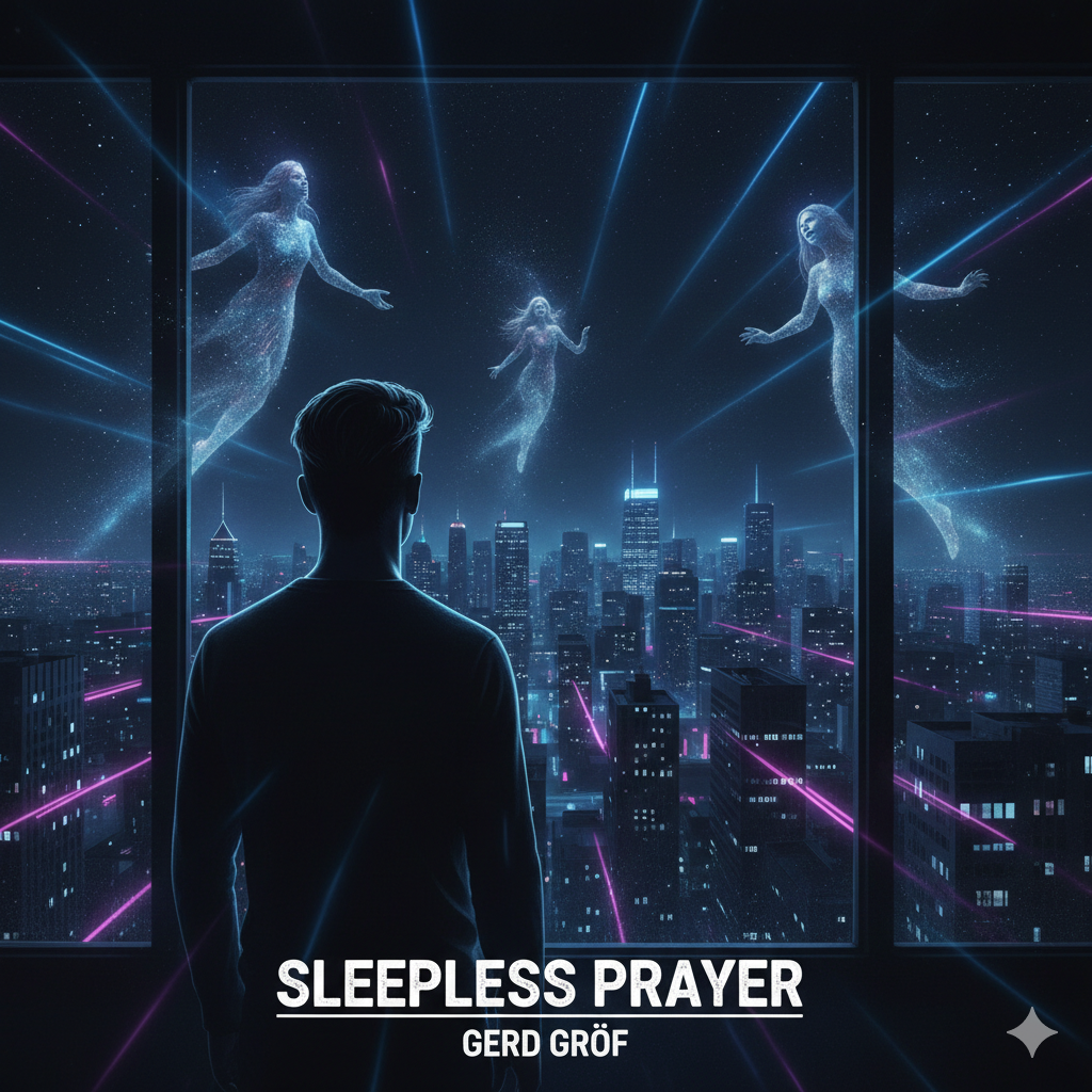 { "action": "image_generation", "action_input": "A cinematic album cover for 'Sleepless Prayer'. A dark, moody city skyline at night with neon blue and purple veins of light. In the foreground, a silhouette of a man looking out of a high-rise window, reflecting in the glass. Ethereal, ghostly female figures made of stardust and light floating in the air outside. Atmosphere is spiritual, calm, and introspective. Style: 90s aesthetic, high contrast, soulful. The text 'Sleepless Prayer' and 'Gerd Groß' is subtly placed at the bottom." }